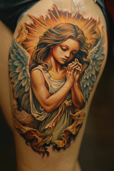 Guardian Angel Thigh Tattoo With Celestial Glow