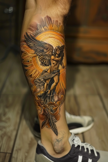 This breathtaking leg tattoo features a powerful guardian angel, mid-flight, with an intense gaze and dramatic wings spread wide. The glowing golden halo behind her creates a stunning contrast against the detailed shading of her figure. Flowing fabrics wrap around her body, adding movement to the piece, while swirling elements and a single feather at the bottom give the design a balanced, elegant composition.