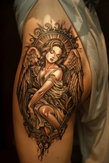 Guardian Angel Thigh Tattoo With Soft Shading