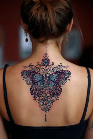 This tattoo transforms the butterfly into a work of ornate art, with every wing filled with swirling filigree and jewel-like details. Shades of teal, purple, and pink blend together to give it a rich, colorful look that feels almost like stained glass. The design sits high on the back, right along the spine, and the decorative extensions make it appear more like a piece of wearable jewelry than just a tattoo.