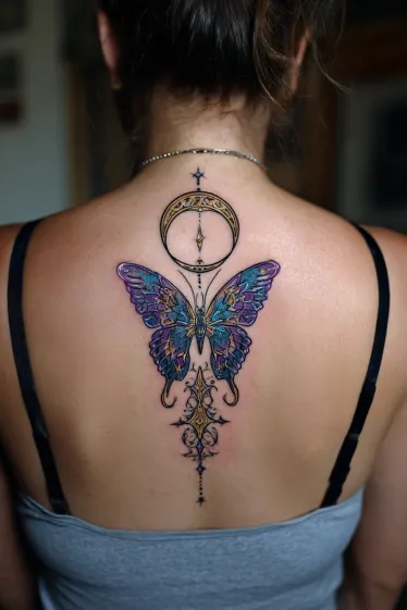 This tattoo blends a vibrant butterfly with an ornamental crescent moon sitting just above it, creating a mystical design that flows down the spine. The butterfly wings shimmer with shades of blue, purple, and gold, while delicate decorative patterns extend vertically to connect the moon and butterfly into one cohesive piece. Small celestial details, like stars and fine line accents, add an enchanting atmosphere to the design.