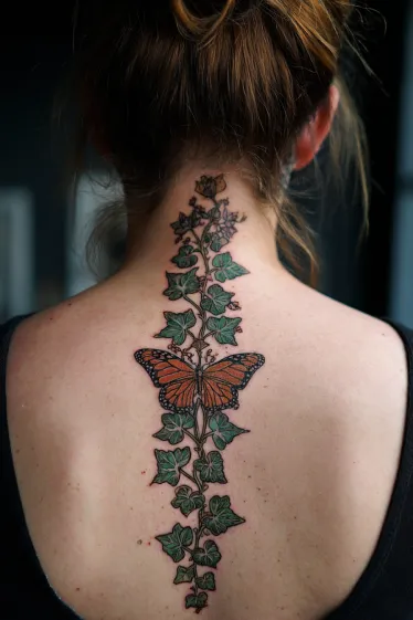 This tattoo features a monarch butterfly resting at the center of the spine, surrounded by a vertical trail of ivy leaves climbing up and down the back. The orange wings of the butterfly contrast beautifully with the rich green leaves, giving the design a natural, earthy feel. The symmetry of the ivy paired with the butterfly makes the tattoo flow seamlessly along the spine.
