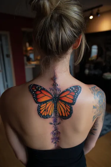 This tattoo features a bold monarch butterfly spread across the upper back with wings glowing in vibrant orange and black. The detailing of the white dots along the edges gives it that classic monarch look, while the wings connect perfectly to a fine line of purple floral accents running down the spine. The design feels striking and symmetrical, making it both powerful and graceful.