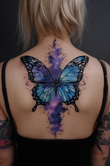 This tattoo places a large butterfly across the upper back, its wings glowing in vivid shades of blue, purple, and turquoise. Behind it, a cosmic galaxy effect stretches down the spine, filled with stars and nebula-like textures that give the design a magical, otherworldly aura. The contrast between the sharp black outlines of the butterfly and the dreamy space background makes the whole piece stand out beautifully.