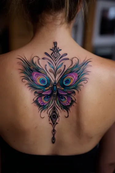 This tattoo transforms the butterfly into something extraordinary by giving its wings the look of peacock feathers. Rich blues, purples, and greens are blended with the iconic eye patterns of peacock plumage, creating a dazzling effect that fans out gracefully across the upper back. Ornamental accents run vertically along the spine, tying the whole design together with a touch of elegance.