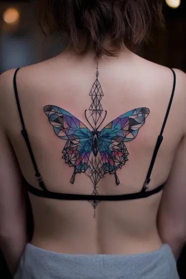 This tattoo showcases a large butterfly across the upper spine with its wings divided into a stunning mosaic of geometric shapes. The colored patterns shift through shades of blue, purple, and pink, giving it a prismatic effect that feels modern and artistic. Black fine-line geometric accents extend above and below the butterfly, tying the whole design into a sleek vertical composition that frames the spine beautifully.