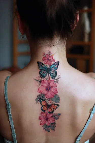 This tattoo combines two butterflies with a trail of pink hibiscus flowers flowing down the spine. The butterflies, one in shades of blue and the other in orange and black, bring contrast and life to the design. The flowers are detailed with soft shading and lush green leaves, giving the whole piece a tropical, feminine vibe that feels vibrant and fresh.
