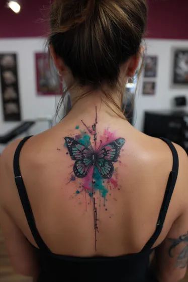 This tattoo highlights a butterfly centered on the upper spine, its wings detailed in shades of teal and black. Around it, splashes of pink and turquoise watercolor create a vibrant background that feels artistic and free spirited. The vertical line running through the middle ties the design neatly to the spine, giving it both structure and flow.