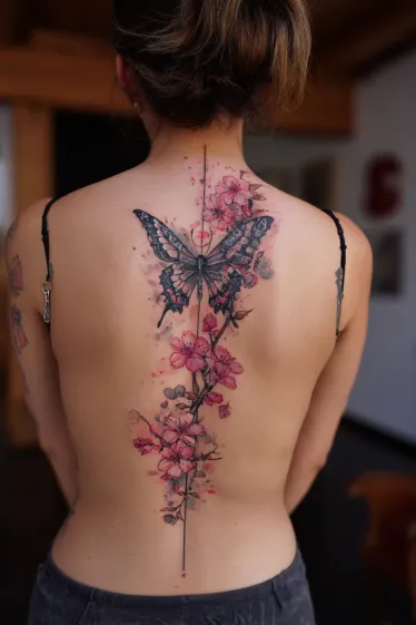 This tattoo beautifully blends a large butterfly at the upper spine with a cascading trail of cherry blossoms that flows all the way down the back. The butterfly wings are filled with dark shading and subtle highlights, while the blossoms bring bursts of soft pink and red that feel delicate and lively. The vertical composition naturally follows the spine, creating an elegant and balanced piece that feels both graceful and bold.