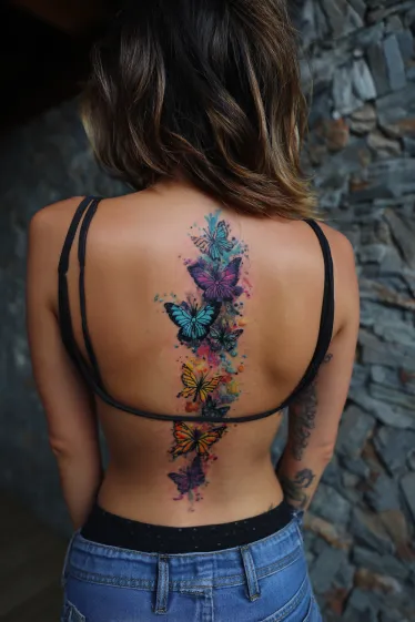 This tattoo bursts with color, featuring a trail of butterflies fluttering down the spine in shades of turquoise, purple, orange, and yellow. The watercolor splashes behind them bring an artistic, almost painted effect, giving the butterflies the look of being in constant motion. Each butterfly is distinct yet connected, creating a beautiful flow from the upper back to the lower spine.
