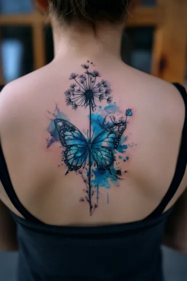 This tattoo blends the image of a butterfly with the softness of a dandelion, creating a whimsical design across the spine. The butterfly s wings glow in shades of blue and black, while watercolor splashes of teal and purple bring energy and movement to the background. Above it, a delicate dandelion adds a dreamy touch, almost like the butterfly is floating through a breeze of wishes.