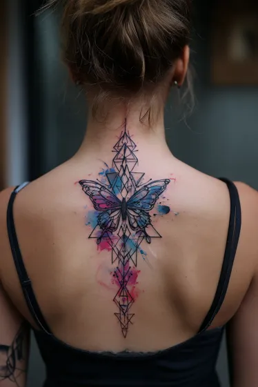 This tattoo combines the sharp precision of geometric linework with the softness of watercolor shading. A butterfly sits at the center of the spine, its wings filled with hints of pink, blue, and purple that blend into splashes of watercolor in the background. The geometric shapes extend vertically above and below the butterfly, giving the design a structured yet artistic feel.