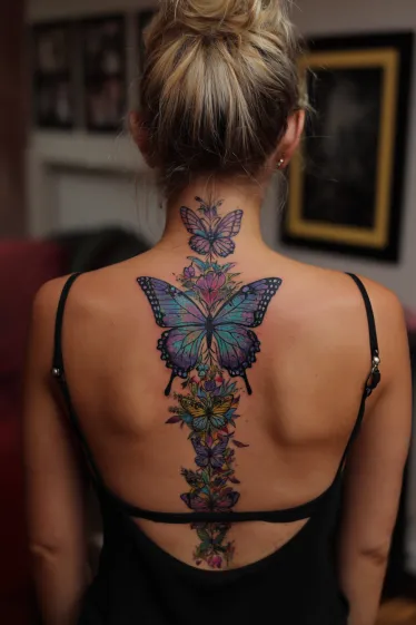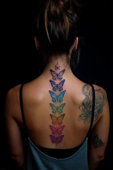 I think this tattoo is amazing because it feels so joyful and uplifting. The rainbow colors make it impossible not to smile, and the vertical design looks incredibly striking on the back. To me, it s a celebration of beauty, individuality, and freedom, and I love how it turns the spine into a colorful runway for butterflies in flight.