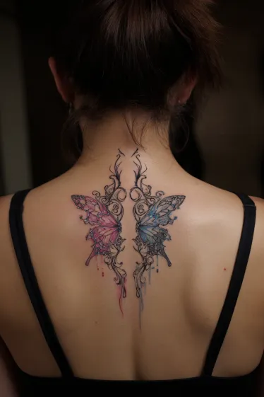 This tattoo features two mirrored butterflies placed along the upper spine, one in shades of pink and the other in cool tones of blue. Their wings are filled with watercolor splashes that fade into delicate ornamental swirls, giving the design a whimsical and artistic vibe. The fine lines and splattered color accents make the butterflies look like they were painted directly onto the skin.