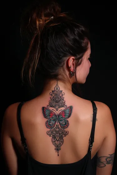 This tattoo places a butterfly at the center of the spine, framed with intricate ornamental designs that extend both upward and downward. The butterfly wings are filled with soft shades of teal and red, while the surrounding patterns are done in detailed blackwork that almost resembles lace. The vertical flow of the design makes it look regal and balanced, like a piece of wearable art.