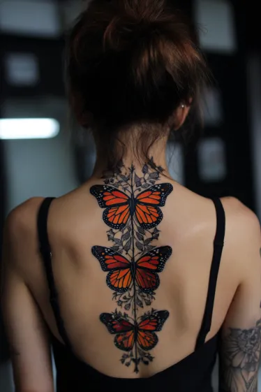 This design features three bold monarch butterflies perfectly aligned along the spine, their fiery orange wings framed with delicate black patterns. Between them, fine floral details add a soft, feminine touch, making the butterflies feel like they are resting gently among vines and blooms. The balance of symmetry and color creates a striking piece that flows beautifully with the natural lines of the back.
