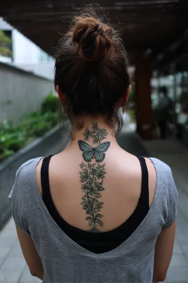 This tattoo features a delicate butterfly resting at the upper spine with its wings shaded in soft hues of blue and green. Flowing down the back, a trail of leafy vines creates a natural frame, giving the design a graceful vertical flow. The mix of subtle color and fine detailing makes the piece feel organic and timeless, almost as if the butterfly has gently landed in a climbing garden.