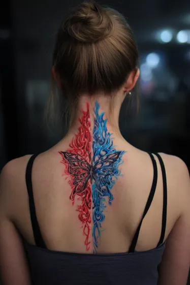 This tattoo features a butterfly split down the middle, with one half surrounded by fiery red flames and the other half engulfed in cool blue flames. The wings are detailed with sharp linework, making the contrast between the two sides even more dramatic. Positioned along the spine, the design creates a bold vertical flow that emphasizes balance and duality.