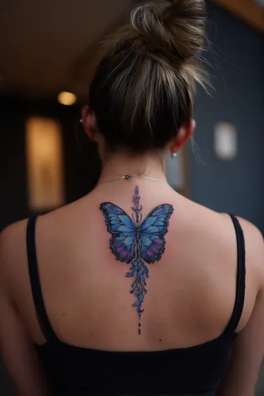 This tattoo features a striking butterfly with wings shaded in vivid blues and purples, sitting perfectly along the upper spine. Its wings are detailed with soft gradients, giving the design a realistic yet artistic glow. Below the butterfly, ornamental accents extend downward in a vertical line, creating balance and making the tattoo feel naturally connected to the spine.
