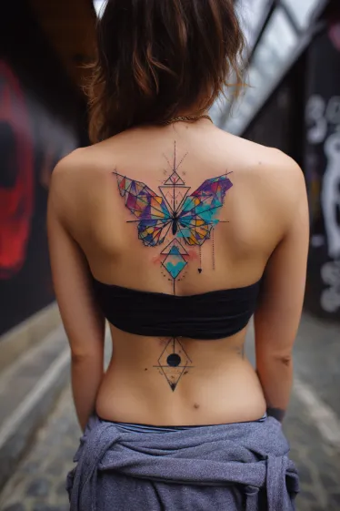 This tattoo brings together a butterfly with a kaleidoscope of geometric shapes and watercolor splashes. The wings are filled with bright shards of orange, teal, purple, and yellow, giving the butterfly a stained-glass effect. Extending along the spine are additional geometric symbols, including diamonds and circles, which make the piece feel modern and abstract.