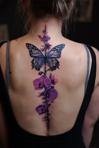 This tattoo features a butterfly with wings shaded in blue and purple perched along the spine, paired with a cascading line of orchids in matching tones. The flowers are detailed with rich violet petals and soft shading, while the butterfly ties the whole design together with its delicate yet vibrant presence. The vertical arrangement makes the piece feel balanced and flowing, almost like a blooming vine.