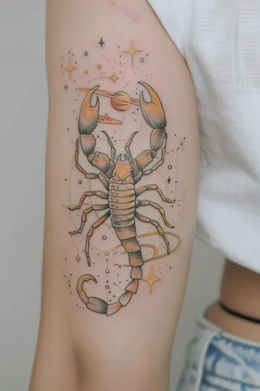 This tattoo features a beautifully stylized scorpion inked in soft shades of golden orange and muted charcoal. It stretches along the upper arm, with stunning linework and cosmic details that make it feel totally out of this world. The claws are holding a little planet with rings, and tiny stars are scattered all around, giving it that magical, celestial glow. There s this super cool flow to it, like the whole thing is floating in space.