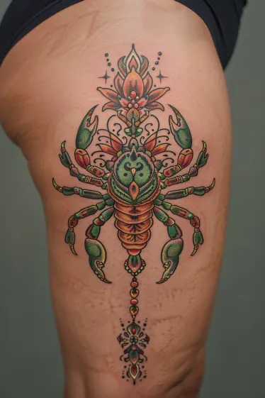 This tattoo brings serious artistic energy with a bold green and orange scorpion at the center of an intricate mandala-inspired design. It s placed along the thigh, stretching vertically with symmetrical floral and ornamental elements at both the top and bottom. The detailing is stunning, with jewel-toned color work, symmetrical patterns, and layered shading that gives it a vibrant, three-dimensional feel. It s fierce, but also completely balanced and beautiful.