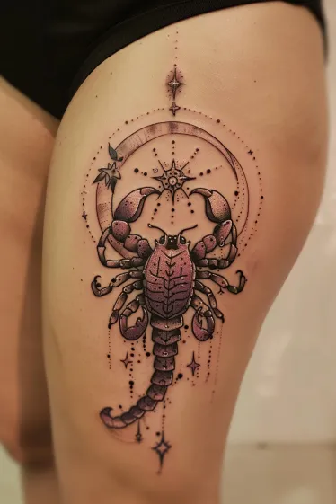 This one s a real showstopper. The tattoo features a bold scorpion inked in deep purples and moody pinks, stretched gracefully across the thigh. Above it, a large crescent moon wraps around a radiant star, all tied together with dotted lines and tiny celestial symbols. The shading on the scorpion s body is rich and textured, giving it a 3D effect that makes it look like it s almost crawling off the skin. Every little dot and sparkle is placed just right, adding a delicate balance to the strong, striking design.