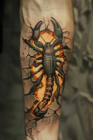 This jaw-dropping tattoo looks like a scorpion is literally bursting out from beneath the skin. The hyper-realistic 3D design shows a bold black scorpion crawling through cracked skin with glowing orange lava-like light underneath. The cracks are incredibly detailed, and the fiery background makes the whole thing feel intense and alive. It s dramatic, fierce and impossible to ignore.