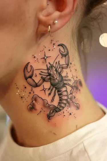 This fierce little neck tattoo features a sleek black and grey scorpion nestled in a dreamy cloud of soft pink haze and twinkling stars. The detailing is super crisp, with that perfect dotwork shading giving the body and claws tons of texture and depth. The placement just below the ear is bold and edgy, while the surrounding sparkles and gentle blush undertones soften the vibe into something almost magical.