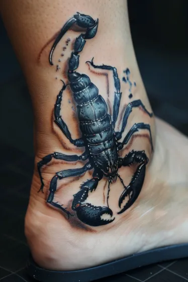 This ankle tattoo features a jet-black scorpion so detailed it looks like it might crawl right off the skin. The glossy highlights and shadow work give it an ultra-realistic vibe, with sharp claws and a perfectly curved tail that wraps naturally around the ankle bone. The 3D effect is on point, making it feel like this little guy is guarding your every step. It s dramatic, sleek, and positioned in such a striking spot that you can t help but stare.