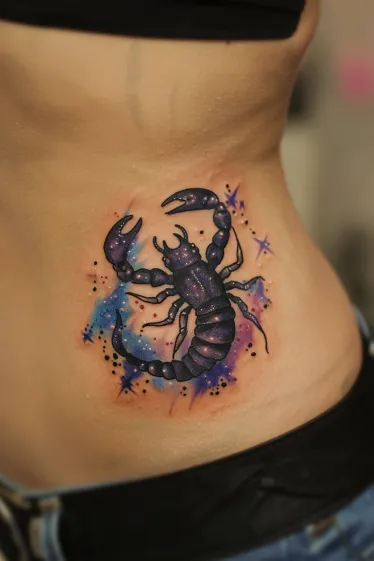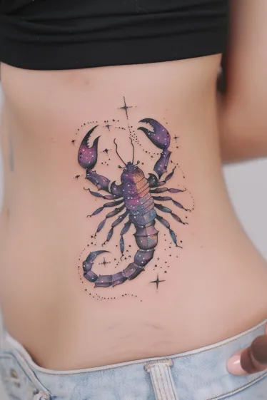 This tattoo shows off a super detailed scorpion with dreamy cosmic vibes. It s inked along the side of the body, with a bold mix of purples, pinks, and subtle starry sparkles. The shading and highlights make it pop off the skin, almost like it s glowing in its own little galaxy. The fine dotted lines outlining the constellation add a delicate, magical touch without taking away from the strong presence of the scorpion itself.