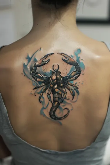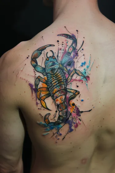 This tattoo is a total explosion of color in the best way. It features a vibrant scorpion inked across the upper back, with a mix of oranges, teals, purples and splattered ink textures that make it look like a piece of abstract art. The detailing on the scorpion s shell is super fine, with dotwork-style shading that gives it this cool, almost scaly look. And those background splashes? They bring the whole thing to life like it s caught mid-motion in a wild burst of energy.
