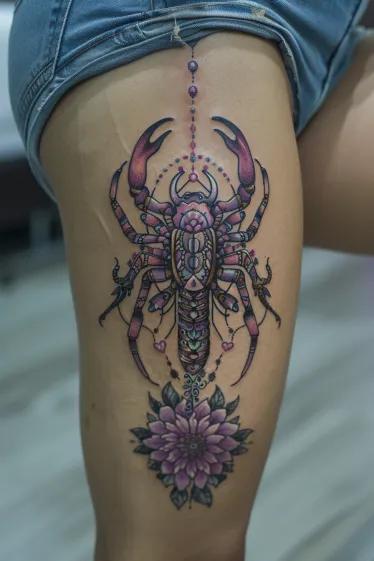 This dreamy mandala-style scorpion tattoo stretches elegantly down the thigh with a design that s full of balance, detail and a whole lot of feminine energy. The scorpion is decorated with gemstone-like accents in soft purples and pinks, and every little section is filled with ornamental shapes that feel like sacred geometry. The stinger trails into a dotted string of beads that leads right to a blooming lotus at the bottom, which adds this peaceful, spiritual vibe to the whole piece.