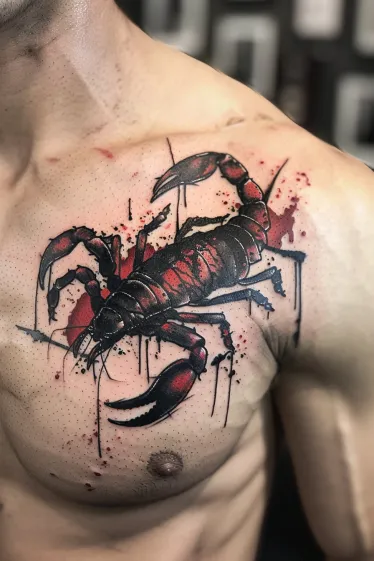 This bold chest tattoo is giving major warrior energy. It features a black and red scorpion that looks like it just burst out of an abstract painting. The watercolor splashes in deep crimson give it a fierce, dramatic effect, while the edgy brush strokes in black add even more movement and intensity. The placement across the chest makes it impossible to ignore, and the way the tail curves toward the collarbone is just pure visual power.