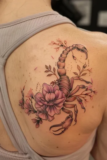 This delicate scorpion tattoo wraps softly across the shoulder blade with dreamy pink florals blooming all around its body. The design blends fine black ink for the scorpion s frame with soft purple and blush shades in the flowers, creating a gorgeous balance of bold and feminine. The flow of the composition hugs the shoulder perfectly, giving it a graceful, natural feel like the scorpion is resting among petals instead of lurking in the shadows.