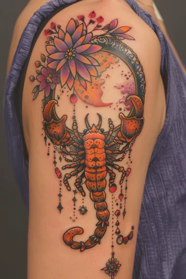 This tattoo is pure Scorpio drama in the best way. Placed beautifully on the upper arm, it features a bright orange scorpion with bejeweled details and an enchanting background that includes a glowing crescent moon and purple flowers. The whole design feels luxurious with dangling ornamental beads and rich jewel tones that give it a tattoo-meets-art-deco vibe. Every part is carefully shaded with deep purples, fiery reds, and warm golds that all tie together so perfectly.