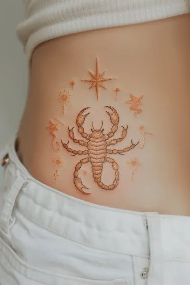 This dainty scorpion tattoo is all about subtle charm and astrological elegance. Inked in a soft golden-orange tone, the scorpion is surrounded by delicate starbursts and tiny celestial flourishes. It s perfectly placed on the waist, giving it that playful yet powerful feel. The linework is super fine, almost like it was stitched on with a cosmic needle. Everything about this design feels soft, balanced and just a little bit magical.