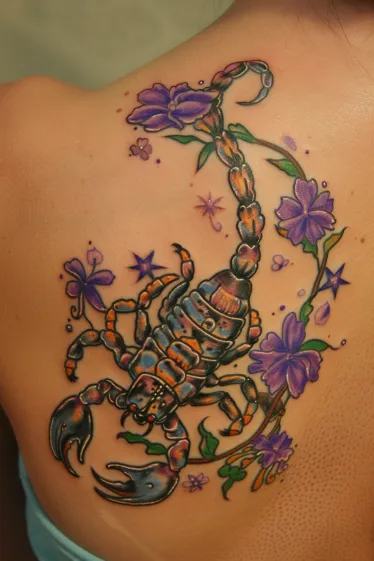 This stunning shoulder tattoo brings together a bold, multi-toned scorpion wrapped in a trail of vibrant purple flowers. The scorpion is full of detail and energy, inked in rich oranges, deep blues and black outlines that make it pop against the skin. The purple blossoms twist around the tail and frame the whole design beautifully, adding softness and movement. Tiny stars and sparkles are scattered throughout, giving the whole piece a bit of whimsy.