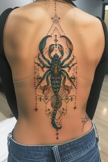 This full back piece is a true masterpiece, blending ornamental design with bold, modern style. The scorpion sits perfectly centered along the spine, its body shaded in deep teal and bronze tones that give it a metallic, almost jewel-like quality. Surrounding it are fine lines and geometric patterns that feel like sacred architecture, creating balance, symmetry, and a little mystery. Everything flows down the back like it was meant to be there all along.
