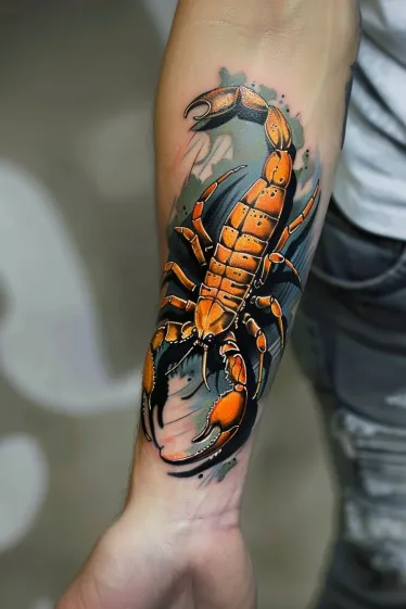 This striking forearm tattoo showcases a bright orange scorpion crawling along the skin with sharp black outlines and intense contrast. The realistic highlights and shadows give it a powerful 3D look, while the splashy background adds just the right touch of artistic flair without stealing the spotlight. The claws are bold and curved, and the tail arcs naturally up the arm like it s ready to strike. It s intense, clean, and unapologetically bold.