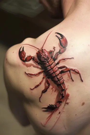 This bold shoulder tattoo features a fierce red scorpion crawling across the skin with insane realism. The shading and highlights give it a lifelike texture, almost like it s ready to skitter off the shoulder at any second. The deep crimson tones are matched with sharp blacks and fine linework that add depth and detail, while the subtle blood-like smudges underneath push the 3D illusion even further.