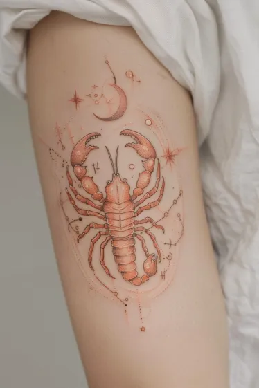 This dreamy little tattoo features a soft peach-toned scorpion surrounded by stars, constellations and a crescent moon, all placed gracefully on the upper arm. The colors are light and almost glowy, giving the whole design a gentle, celestial charm. The tiny dots and fine lines add movement and flow, while the scorpion itself stays front and center with smooth shading and just enough attitude to keep it interesting.