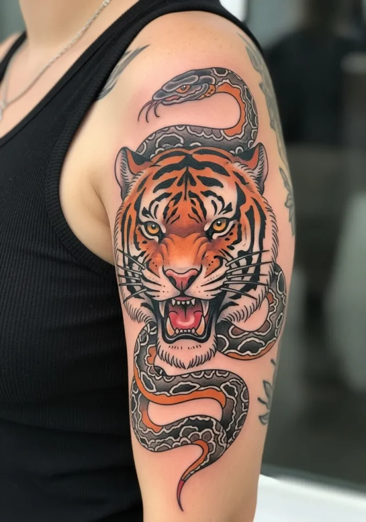 This bold arm tattoo combines two powerful symbols a tiger and a snake. The snake wraps gracefully around the tiger s head, adding motion and tension to the piece. The crisp lines, balanced shading, and mix of orange, black, and muted browns make it an eye-catching design that looks both traditional and fresh.