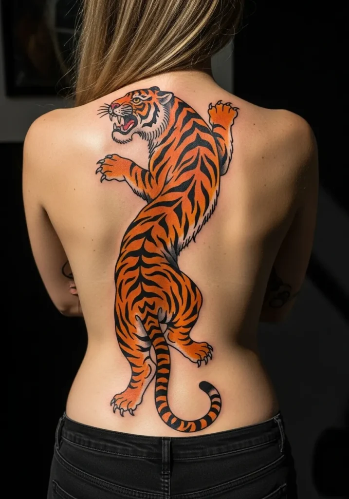 This massive tattoo stretches down the spine, showing a tiger climbing with its claws out. The vivid orange and black stripes create a strong contrast against the skin, and the composition fits the natural lines of the back perfectly. It s a statement piece that radiates old-school charm.