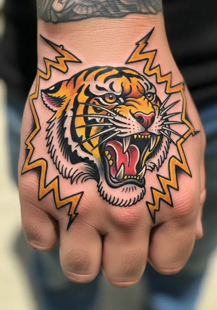 This electrifying hand tattoo features a roaring tiger surrounded by lightning bolts. The design is compact yet striking, with strong black outlines and radiant orange tones that contrast beautifully against the skin. It s fierce, flashy, and impossible to miss.