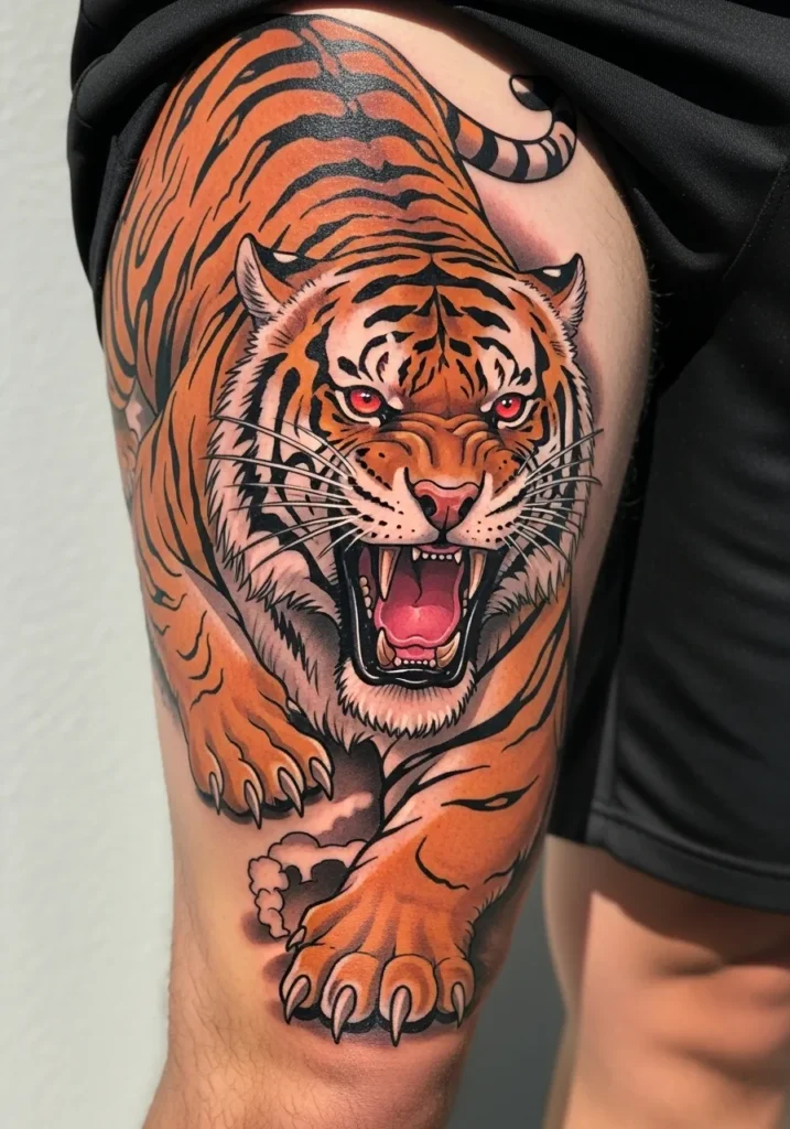 This large thigh tattoo features a crouching tiger in vivid orange and black, its claws digging in as if ready to pounce. The details around the face and fur add so much dimension, and the red glow in the eyes gives it a fierce, fiery look. It s the perfect piece for anyone who loves dramatic, high-impact tattoos.