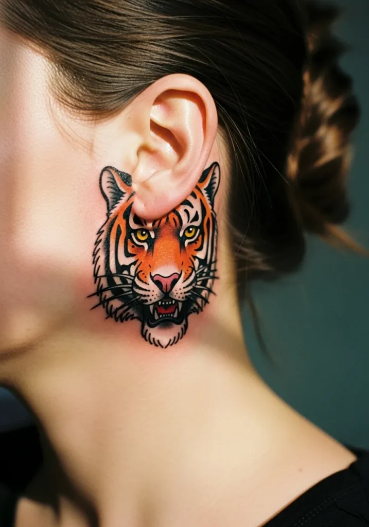 This small tiger head tattoo placed just below the ear looks fierce yet elegant. The traditional orange and black palette makes it unmistakably bold, while the placement gives it a subtly rebellious feel. The detailing is crisp, with the tiger s golden eyes adding a touch of fire.