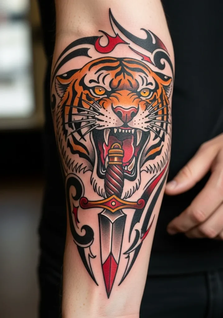 This forearm tattoo features a fierce tiger head with a dagger gripped between its teeth. The bold red accents and clean black outlines make it pop beautifully. The symmetrical layout gives it that classic American Traditional look, while the details in the fur and blade add intensity.