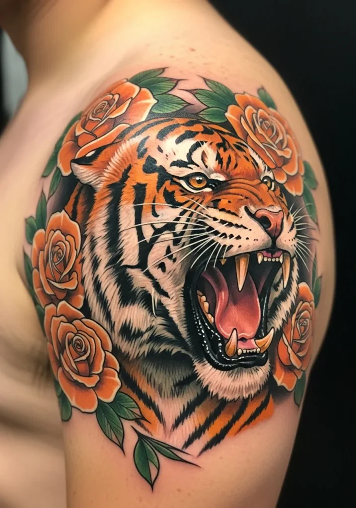 This shoulder tattoo features a roaring tiger framed by bright orange roses and lush green leaves. The color palette ties everything together beautifully, and the detail in the petals softens the overall look while keeping it bold and classic.